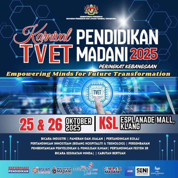 Get ready for an exciting and educational weekend at the Karnival Pendidikan TVET Madani 2025 featuring skills, innovation, and creativity through engaging activities, exhibitions, and competitions!